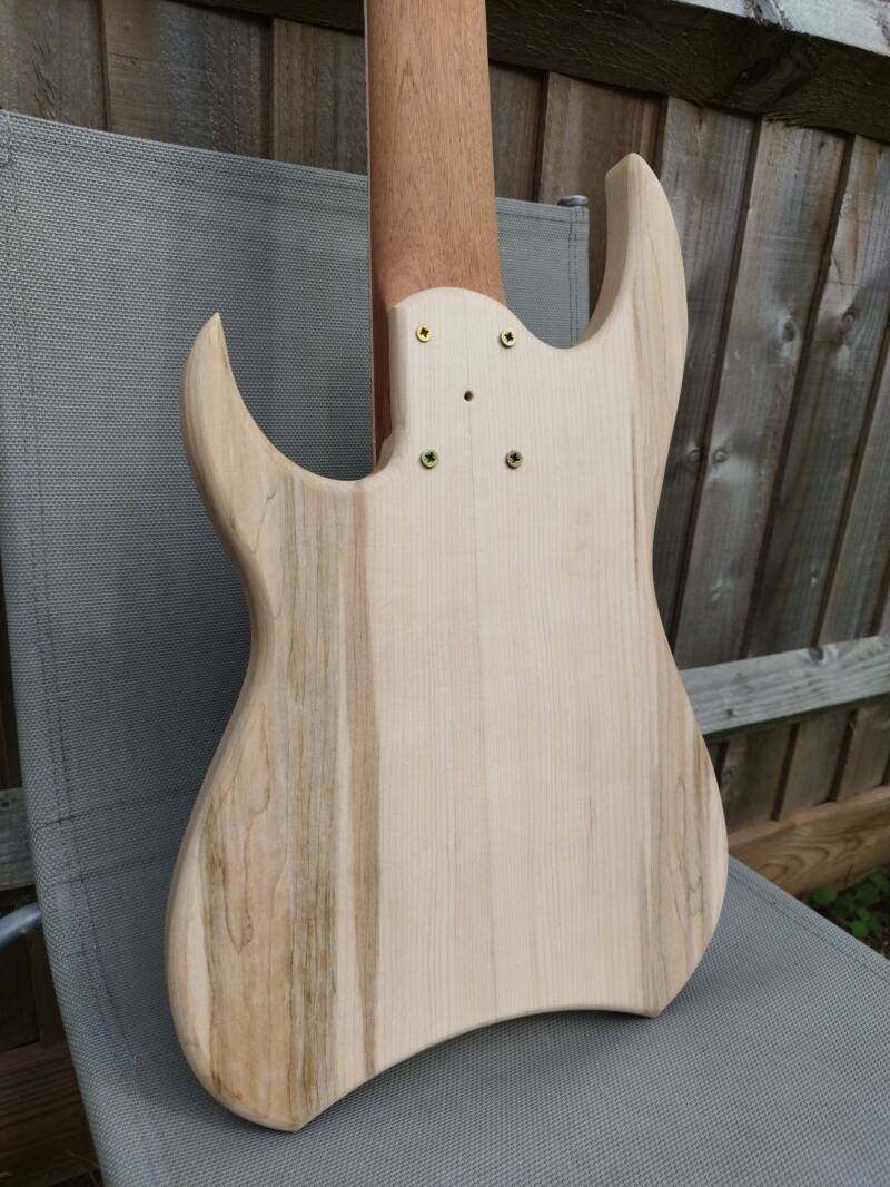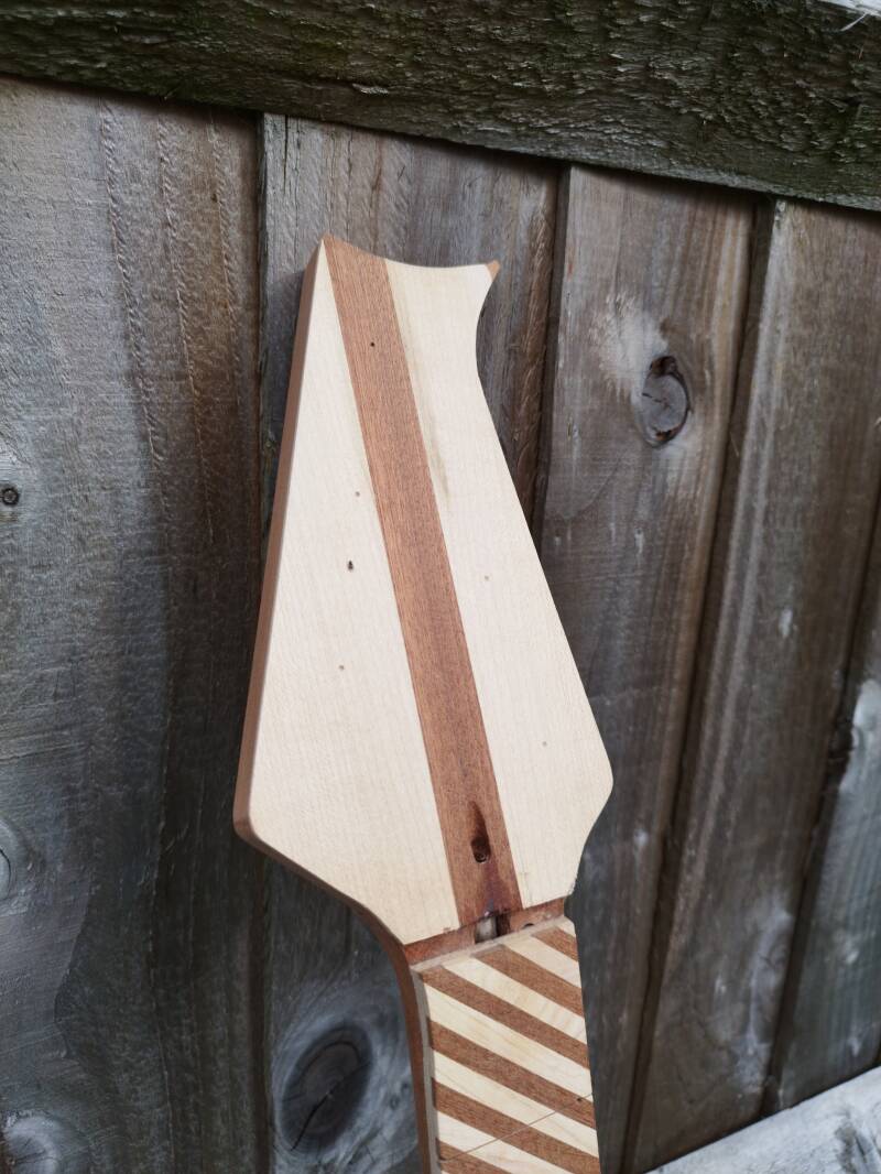 As I have made a few guitars now I thought I would try my hands at a bass guitar. This is my own design which I think looks quite nice. I made the string spacing 18mm as 19mm+ seems a bit wide. As per my previous Jade Green Stratocaster, I made the neck with Sapele and the fretboard from Sapele and Ash in a diagonal pattern radiused to 16 inches. The headstock is in a 3-2 configuration.
